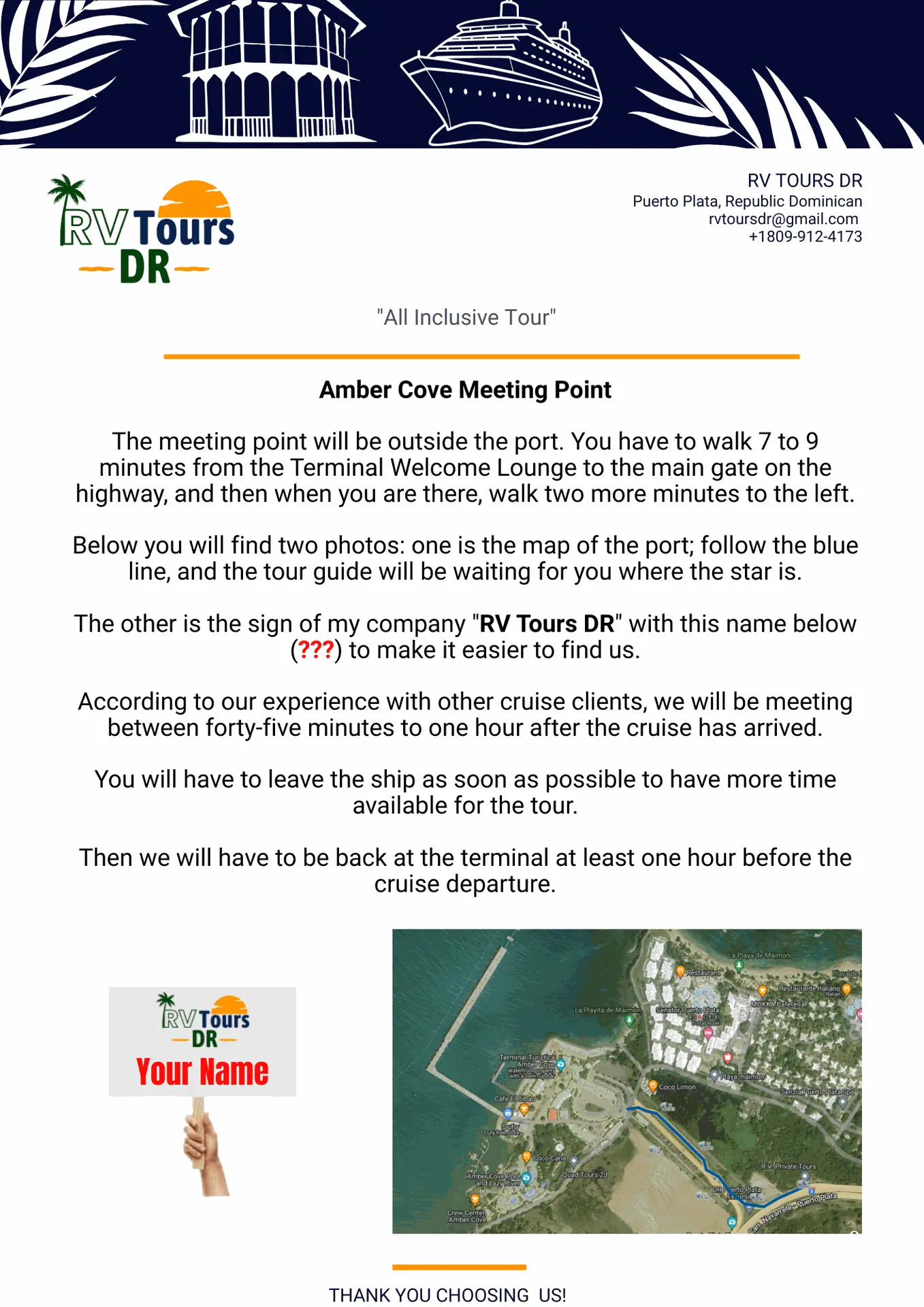 Information regarding cancellation, refunds, and meeting points for cruise passengers.